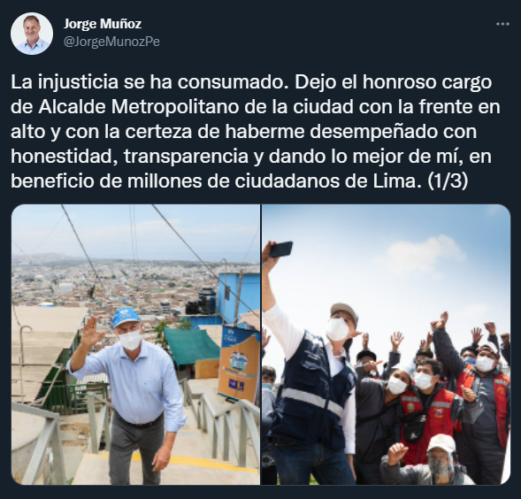 “La injusticia se ha consumado. Dejo el honroso cargo de alcalde metropolitano de la ciudad con la frente en alto y con la certeza de haberme desempeñado con honestidad, transparencia y dando lo mejor de mí, en beneficio de millones de ciudadanos de Lima”, escribió.