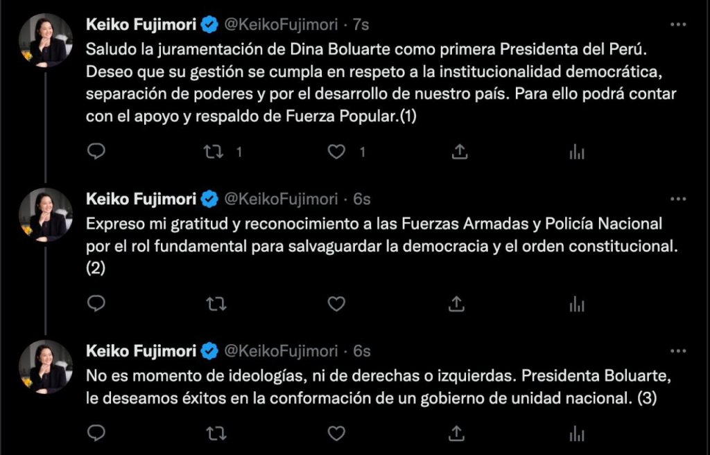 “Saludo la juramentación de Dina Boluarte como primera Presidenta del Perú. Deseo que su gestión se cumpla en respeto a la institucionalidad democrática, separación de poderes y por el desarrollo de nuestro país. Para ello podrá contar con el apoyo y respaldo de Fuerza Popular“, escribió la excandidata presidencial en su cuenta de Twitter.
