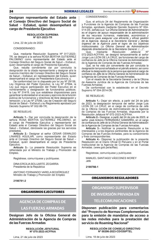 “Que, mediante Resolución Suprema N° 017-2023-TR, se designó a la señora ROSA BERTHA GUTIÉRREZ PALOMINO como representante del Estado ante el Consejo Directivo del Seguro Social de Salud – EsSalud, quien desempeña el cargo de Presidenta Ejecutiva”, se lee en El Peruano.