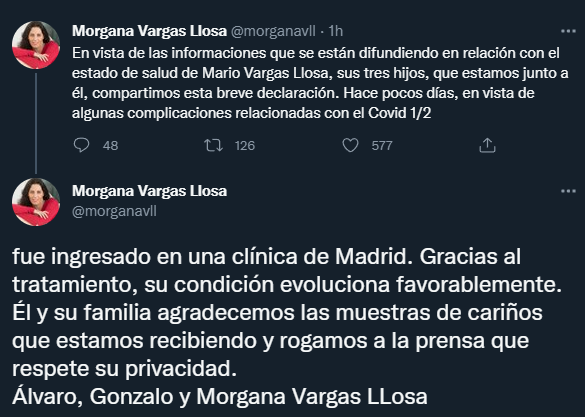 “En vista de las informaciones que se están difundiendo en relación con el estado de salud de Mario Vargas Llosa, sus tres hijos, que estamos junto a él, compartimos esta breve declaración. Hace pocos días, en vista de algunas complicaciones relacionadas con el COVID, fue ingresado en una clínica de Madrid”, escribió Morgana Vargas Llosa en su cuenta de Twitter.