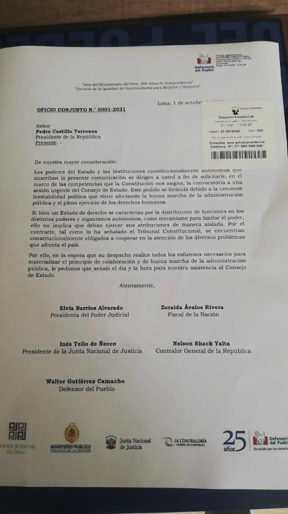 “Los poderes del Estado y las instituciones constitucionalmente autónomas que suscriben la presente comunicación se dirigen a usted a fin de solicitarle, en el marco de las competencias que la Constitución nos asigna, la convocatoria a una sesión urgente del Consejo de Estado”, detalla parte del oficio.