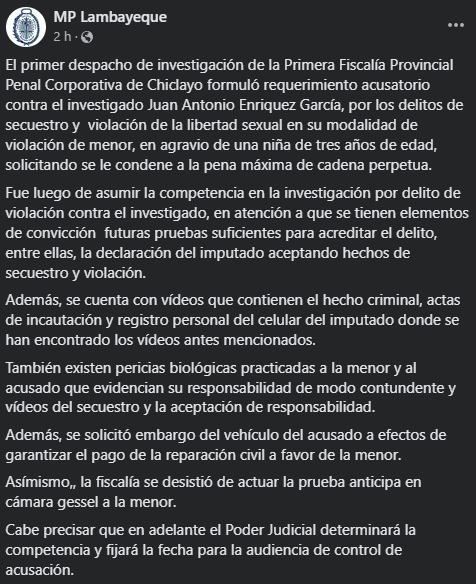 La solicitud de la Primera Fiscalía Provincial Penal Corporativa de Chiclayo formuló la solicitud por los delitos de secuestro y violación de la libertad sexual, en la modalidad de violación a una menor de edad. El comunicado se emitió mediante las redes sociales de la Fiscalía de Lambayeque.