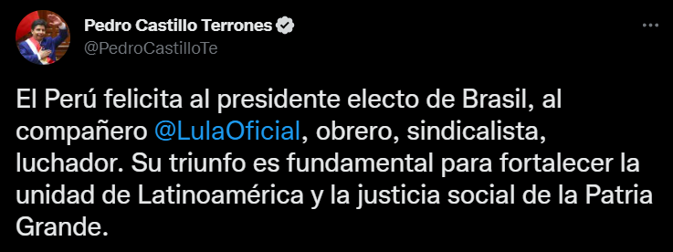 “El Perú felicita al presidente electo de Brasil, al compañero Lula Da Silva, obrero, sindicalista, luchador. Su triunfo es fundamental para fortalecer la unidad de Latinoamérica y la justicia social de la Patria Grande”, escribió el jefe de Estado en su cuenta de Twitter.