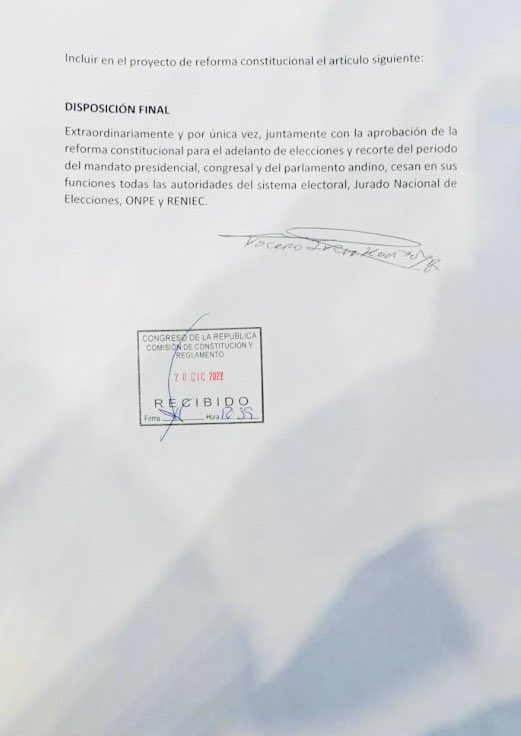 La agrupación remitió la solicitud a la Comisión de Constitución este martes 20 de diciembre, durante el cuarto intermedio del debate para adelantar los comicios a diciembre de 2023. El documento lo envió el vocero de la bancada de derecha, Jorge Montoya.