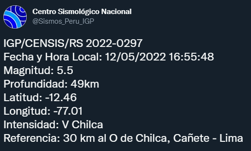 Mantén siempre lista tu mochila de emergencia. Un sismo de magnitud 5.5 se sintió en Lima este jueves 12 de mayo a las 04:55 p. m. El movimiento telúrico se localizó a 30 kilómetros al oeste de Chilca. Así informó el Instituto Geofísico del Perú (IGP) vía Twitter.