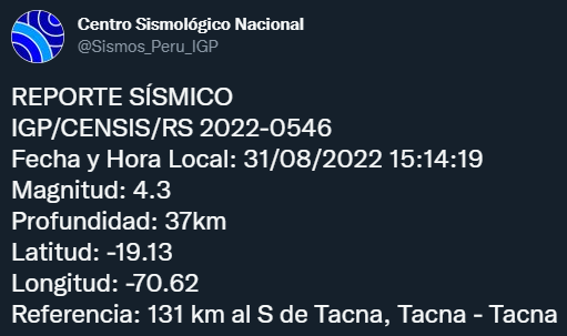 Mantén siempre lista tu mochila de emergencia. Un sismo de magnitud 4.3 se sintió en Tacna este miércoles 31 de agosto a las 3:14 p. m. El movimiento telúrico se ubicó a 131 kilómetros al sur del distrito homónimo. Así informó el Instituto Geofísico del Perú (IGP) en Twitter.