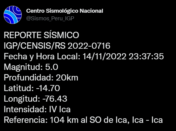 Mantén siempre lista tu mochila de emergencia. Un sismo de magnitud 5.0 se sintió en Ica este lunes 14 de noviembre a las 11:37 p. m. El movimiento telúrico se ubicó a 104 kilómetros al suroeste del distrito homónimo. Así informó el Instituto Geofísico del Perú (IGP) vía Twitter.