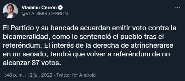 “El Partido y su bancada acuerdan emitir voto contra la bicameralidad, como lo sentenció el pueblo tras el referéndum. El interés de la derecha de atrincherarse en un senado, tendrá que volver a referéndum de no alcanzar 87 votos”, escribió Cerrón.