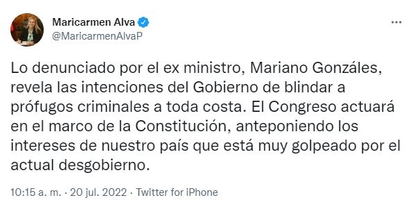 “Lo denunciado por el exministro Mariano Gonzáles revela las intenciones del Gobierno de blindar a prófugos criminales a toda costa. El Congreso actuará en el marco de la Constitución, anteponiendo los intereses de nuestro país que está muy golpeado por el actual desgobierno”, escribió Alva en su cuenta de Twitter.