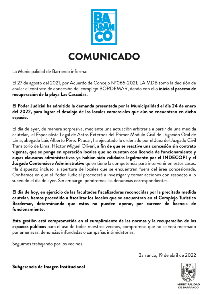 En esa línea, la alcaldía del distrito comunicó que tal medida cautelar fue una actuación arbitraria ante las clausuras administrativas que ya habían sido aceptadas legalmente por Indecopi y el Juzgado Contencioso Administrativo. Además, hicieron un llamado al Poder Judicial para que realicen las investigaciones correspondientes y tomen las acciones del caso.