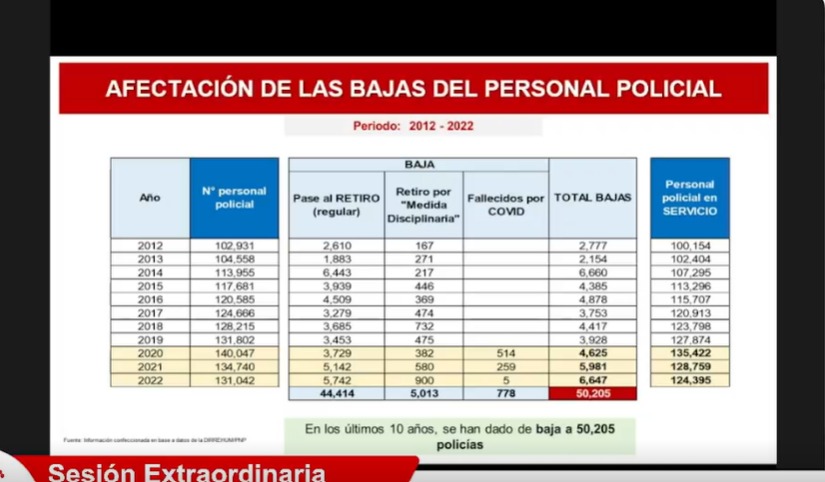Otro dato importante señalado por Vicente Romero, es la cantidad de agentes policiales, que se han dado de baja del servicio en los últimos 10 años, período 2012-2022, siendo un total de 50’205 policías. En la estadística presentada, no se consideró la cantidad de efectivos policiales afectados por el COVID, que ya no pueden realizar operaciones en la calle.