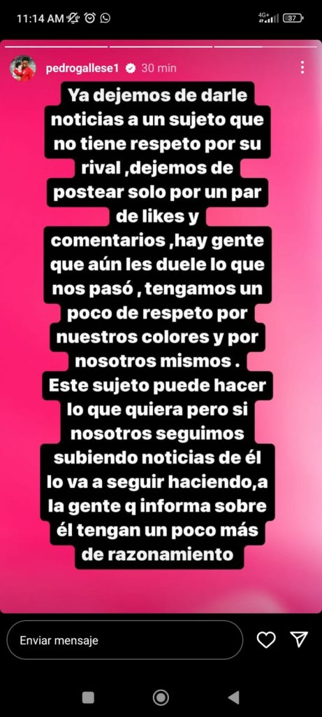 El ‘pulpo’ se expresó por medio de su cuenta de Instragram, donde publicó un comunicado en sus historias diciendo: “Ya dejemos de darle noticias a un sujeto que no tiene respeto por su rival, dejemos de postear solo un par de likes y comentarios, hay gente que aún les duele lo que nos pasó, tengamos un poco de respeto por nuestros colores y por nosotros mismos. Este sujeto puede hacer lo que quiera pero si nosotros seguimos subiendo noticias de él lo va a seguir haciendo, a la gente que informa sobre él tengan un poco más de razonamiento”.