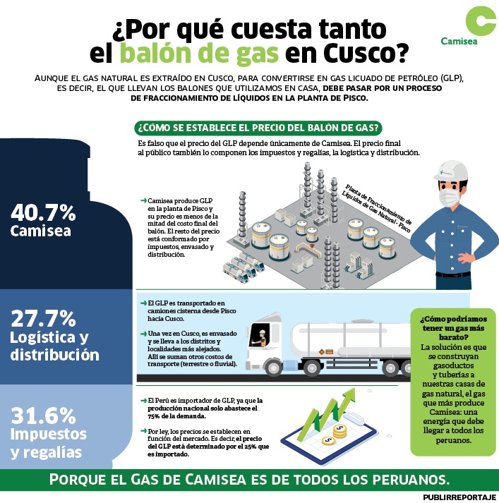 A pesar de esto, es falso que el precio del balón de GLP dependa únicamente de Camisea, pues solamente le corresponde el 40% del costo total. El precio final del balón de GLP que llega al público lo componen impuestos y regalías (31.6%), y logística y distribución (27.7%).