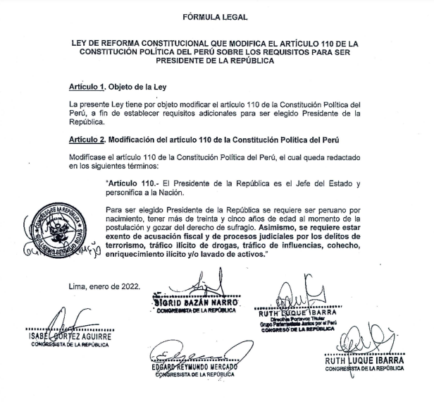 La bancada de Juntos por el Perú presentó este miércoles 2 de febrero un proyecto de ley de reforma constitucional que establece nuevos requisitos para ser elegido presidente de la República, modificando el artículo 110 de la Constitución.