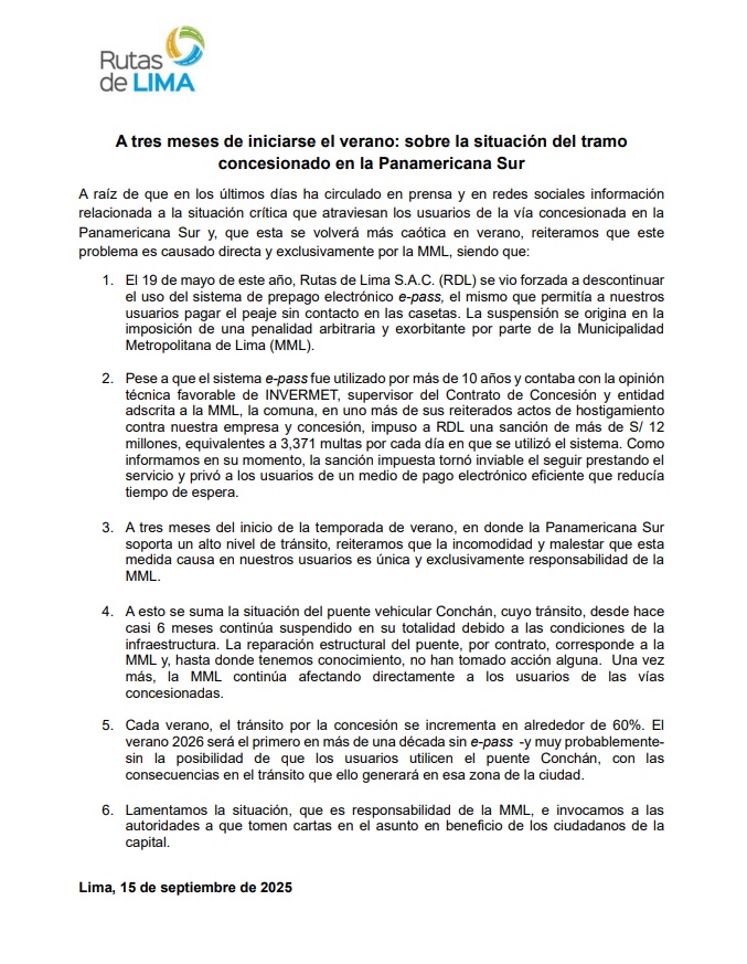 Y es que Rutas de Lima menciona que “el 19 de mayo de 2025, Rutas de Lima S.A.C. (RDL) se vio forzada a es continuar el uso del sistema de prepago electrónico e-pass (…) La suspensión se origina en la imposición de una penalidad arbitraria y exorbitante por parte de la Municipalidad Metropolitana de Lima (MML)”.