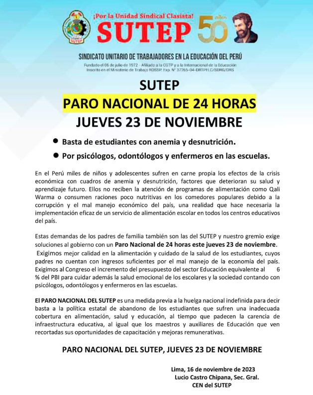 El Sindicato Único de Trabajadores de la Educación del Perú (SUTEP) ha confirmado un paro nacional de 24 horas a partir del 23 de noviembre debido a la desatención y falta de cumplimiento de compromisos por parte del Gobierno.