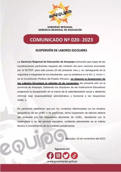 Tras el anuncio de esta manifestación, la Gerencia Regional de Educación de Arequipa ha decidido suspender las clases. Los directores de las instituciones educativas deberán programar la recuperación de clases dentro del marco de la calendarización anual, informando a las respectivas Unidades de Gestión Educativa Local (UGEL) bajo responsabilidad administrativa y funcional.