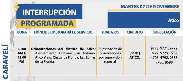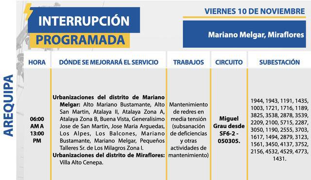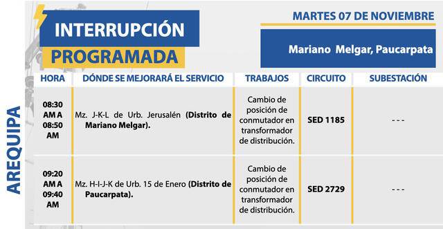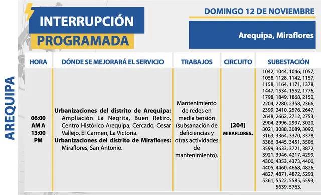 Anuncian cortes de luz en diversas zonas de Arequipa del 7 al 12 de noviembre