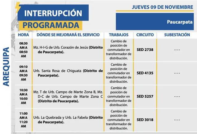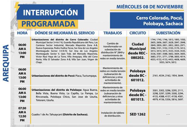 – Miércoles 8 de noviembre: los distritos de Cerro Colorado, Pocsi, Polobaya y Sachaca, de la provincia de Arequipa.