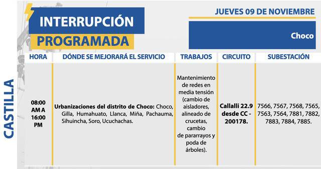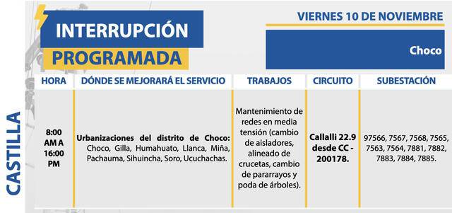 – Jueves 9 de noviembre: distrito de Paucarpata, en la provincia de Arequipa, y el de Choco, en la provincia de Castilla.