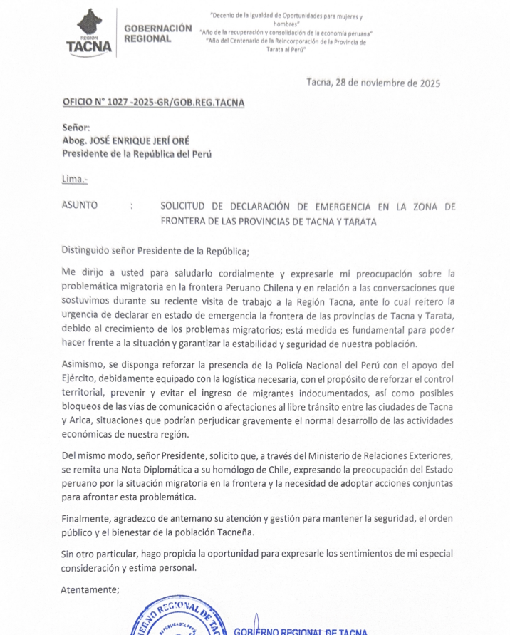 A través de un oficio, el gobernador regional, Luis Ramón Torres, advirtió que esta medida es necesaria para garantizar la seguridad y estabilidad de la población local, así como para prevenir eventuales bloqueos de vías y afectaciones al libre tránsito entre Tacna y Arica.