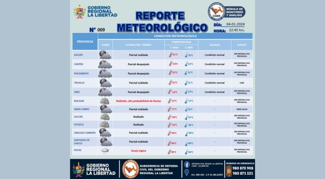De acuerdo con el Reporte Climatológico N.° 009 del Centro de Operaciones de Emergencia Regional (Coer) de La Libertad, a las 10:45 de la noche del jueves 4 de enero se produjo una ligera lluvia en Pataz; no obstante, la temperatura descendió hasta los 9 grados Celsius. Dada las condiciones climáticas, el granizo comenzó a caer sobre cientos de hectáreas afectando a varios agricultores de la zona. Luego se convirtió en una torrencial lluvia.