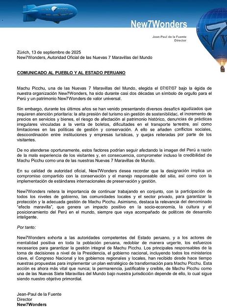 La organización New7Wonders, que en 2007 declaró a Machu Picchu como una de las Nuevas 7 Maravillas del Mundo, emitió un pronunciamiento alertando que los conflictos sociales, la falta de coordinación institucional y la mala experiencia de los visitantes podrían dañar la imagen del Perú y hasta poner en riesgo la permanencia del santuario en esta prestigiosa lista mundial.
