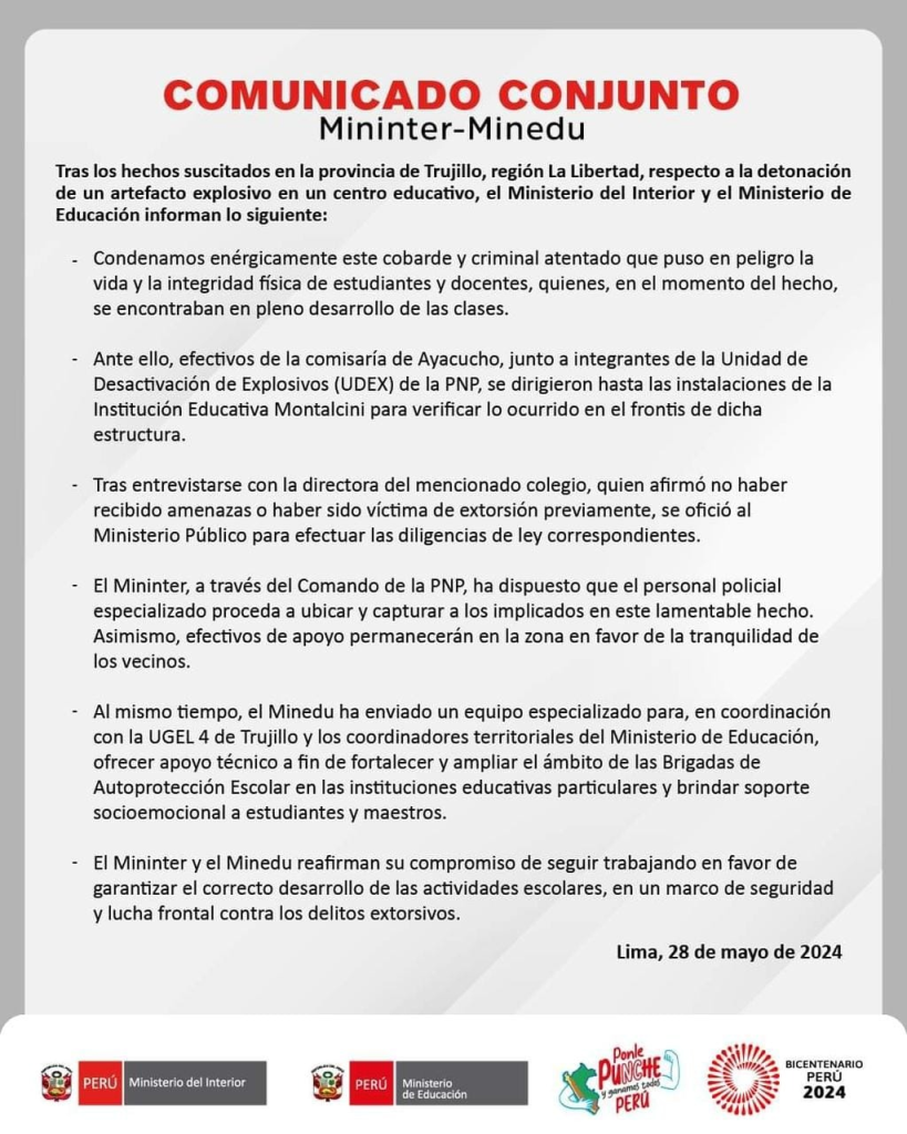 El ministerio del Interior y Educación emitió un comunicado en conjunto luego que se conociera que en los exteriores colegio privado Montalcine European College, ubicado en la calle Las Casuarinas, en la ciudad de Trujillo, se dejó un explosivo a plena luz del día y cuando los estudiantes se encontraban en horario de clases.
