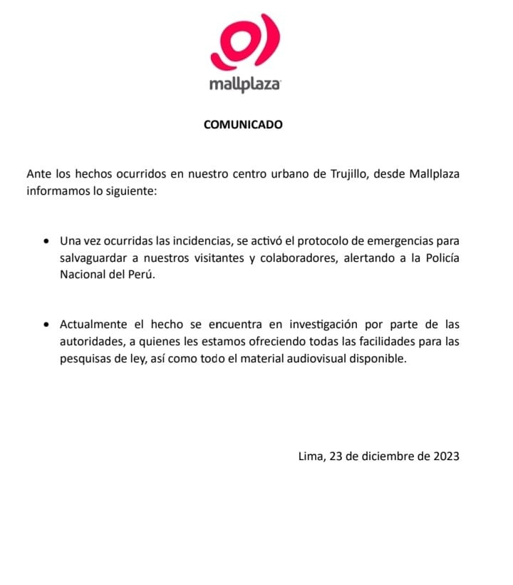 El centro comercial Mall Plaza Trujillo emitió un corto comunicado en el que resaltó que “una vez ocurridas las incidencias se activó el protocolo de emergencias para salvaguardar a nuestros visitantes y colaboradores, alertando a la PNP.