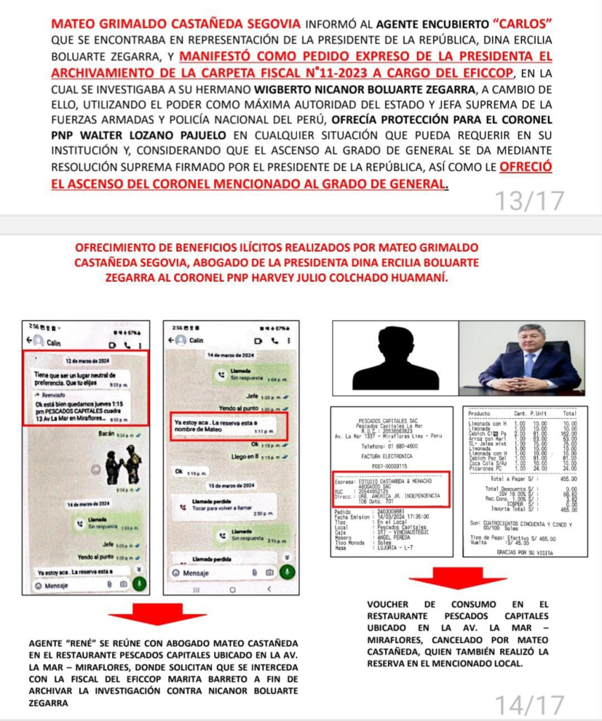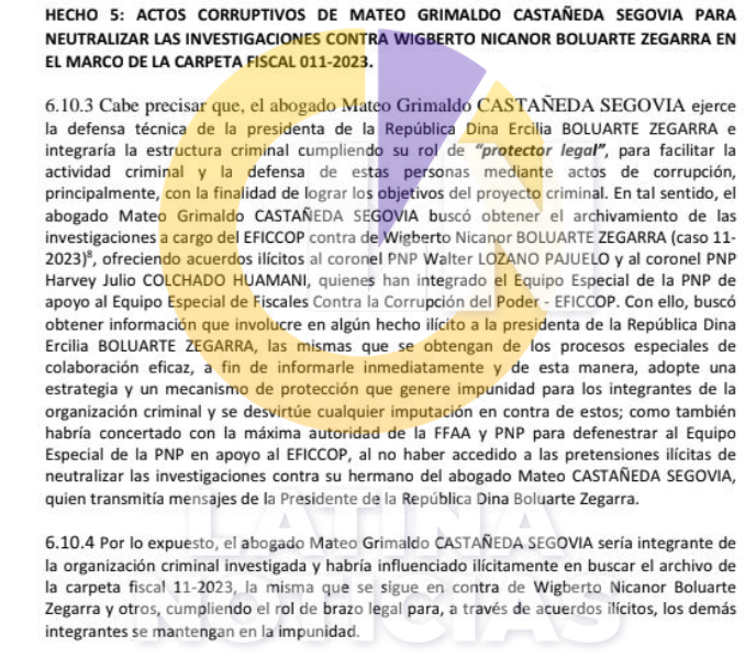 Según la resolución del Primer Juzgado de Investigación Preparatoria Nacional, al que Latina Noticias accedió, se lee que Castañeda buscó el archivamiento de los casos del hermano de la jefa de Estado. Para ello, buscó a Colchado y al coronel PNP Walter Lozano Pajuelo, a quienes les ofreció “acuerdos ilícitos”. Además, también apuntaba a conseguir información de algún hecho ilícito que implicase a Boluarte Zegarra.