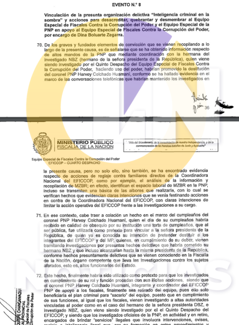 «Este hecho, finalmente habría sido utilizado como pretexto para que los investigados en cumplimiento de su rol y función procedan con sus ilícitas acciones, siendo que el coronel PNP Harvey Colchado Huamaní, integrante y coordinador del EFICCOP PNP de apoyo a los fiscales, finalmente sea retirado del equipo, pues ello solo beneficiaría al plan criminal para ‘sacarlo’ del equipo, puesto en cumplimiento de sus funciones, al igual que los fiscales, vienen investigando a altas autoridades vinculadas al poder como en el caso del hermano de la señora presidenta DBZ, e investigado NBZ, quien viene siendo investigado por el Quinto Despacho del EFICCOP», se lee en el documento fiscal.