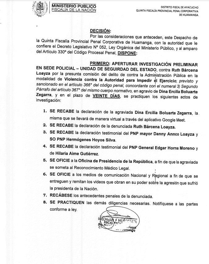 Al respecto, el Ministerio Público abrió una carpeta fiscal por el presunto delito contra la administración pública en la modalidad de violencia contra la autoridad para impedir el ejercicio de sus funciones. El fiscal Brechman Muñoz, de la Quinta Fiscalía Provincial Penal Corporativa de Huamanga, quedó a cargo, citándolas a ambas para obtener sus testimonios el miércoles 31 de enero.