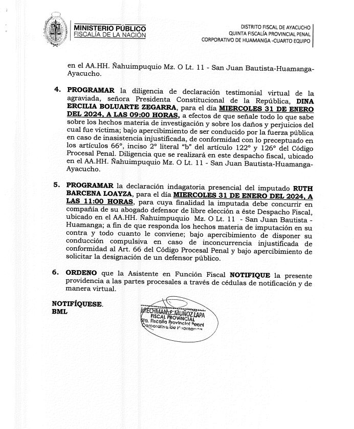 Este domingo 11 de febrero se cumple el plazo para que el fiscal Brechman Muñoz defina si se archiva o se continúa la investigación contra Ruth Bárcena Loayza, acusada de agredir a la presidenta Dina Boluarte durante una visita en Ayacucho, así lo confirmó la abogada de Bárcena y responsable del área legal de la Asociación Pro Derechos Humanos (Aprodeh), Gloria Cano.