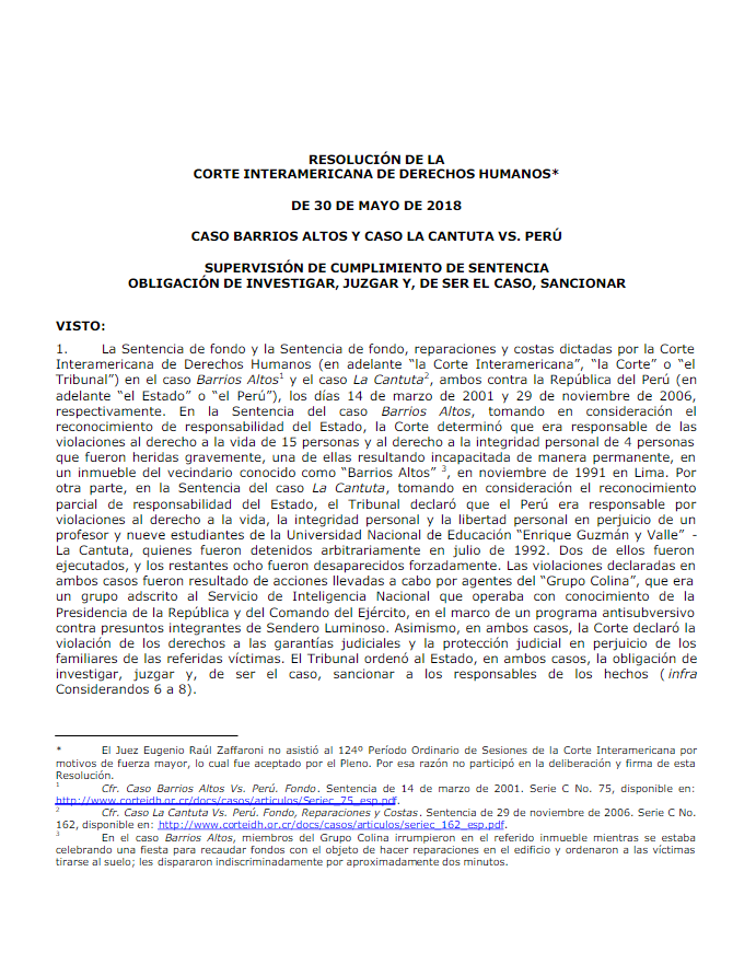Ante el indulto otorgado por PPK a fines del 2017, la Corte Interamericana de Derechos Humanos (Corte IDH) emitió una resolución en donde recalca que los estados tienen el compromiso de cumplir con lo determinado por la Corte, de acuerdo a la Convención Americana.