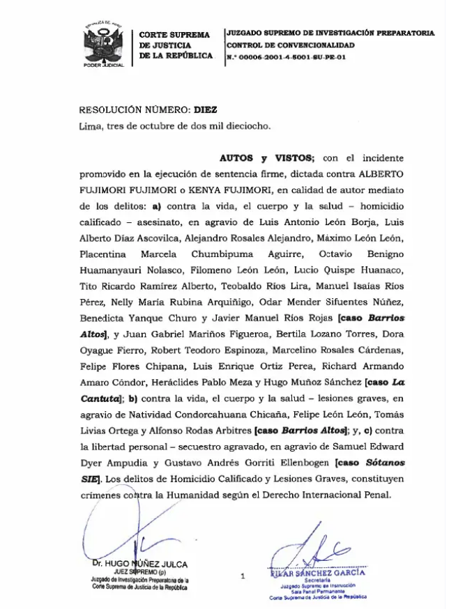 En octubre de 2018, el exmagistrado Hugo Núñez Julca del Juzgado de Investigación Preparatoria de la Corte Suprema anuló el indulto a favor de Alberto Fujimori otorgado en el 2017.