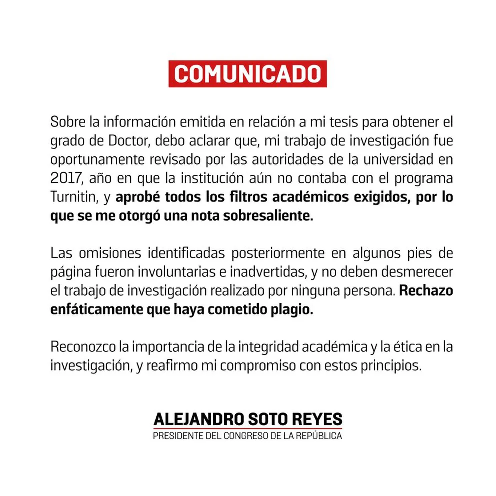 “Sobre la información emitida en relación con mi tesis para obtener el grado de doctor, debo aclarar que mi trabajo de investigación fue oportunamente revisado por las autoridades de la universidad en 2017, año en que la institución aún no contaba con el programa Turnitin, y aprobé todos los filtros académicos exigidos, por lo que se me otorgó una nota sobresaliente”, afirmó Soto en un comunicado.