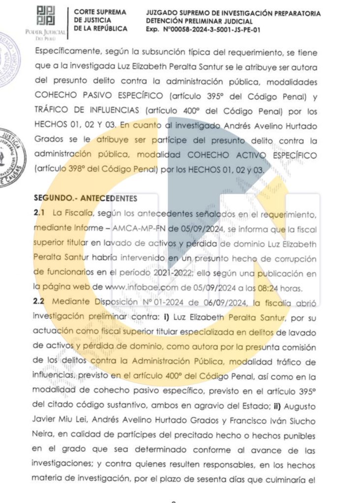 La Segunda Fiscalía Suprema Transitoria Especializada en delitos cometidos por Funcionarios Públicos sostiene que Luz Elizabeth Peralta Santur y Andrés Avelino Hurtado Grados se les habría encontrado indicios de la comisión de delito en tres hechos: