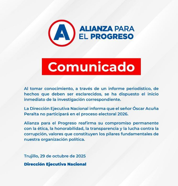 Asimismo, la Dirección Ejecutiva Nacional informó que, como medida preventiva, Óscar Acuña no participará en el proceso electoral del 2026 mientras duren las indagaciones.
