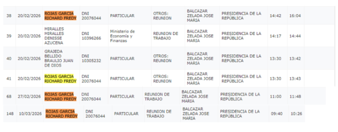 Latina Noticias tuvo acceso al registro de visitas del Despacho Presidencial del presidente Balcázar y encontró que Rojas estuvo con él hasta las 10.26 a. m., es decir, 46 minutos. No obstante, tras hacer un barrido de sus visitas en sus 20 días de gobierno, constatamos que fue visitado por este mismo personaje cuatro veces.