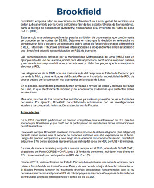“Esta es solo una orden procedimental para la exhibición de documentos que comúnmente se concede en las cortes de EE.UU. Dejamos en claro que la decisión en referencia no constituye un fallo o siquiera un comentario sobre temas de fondo relacionados a Brookfield o RDL. Mas bien, Tribunales arbitrales internacionales e independientes sí han establecido que Brookfield adquirió su participación en RDL de buena fe”, se lee en el documento.