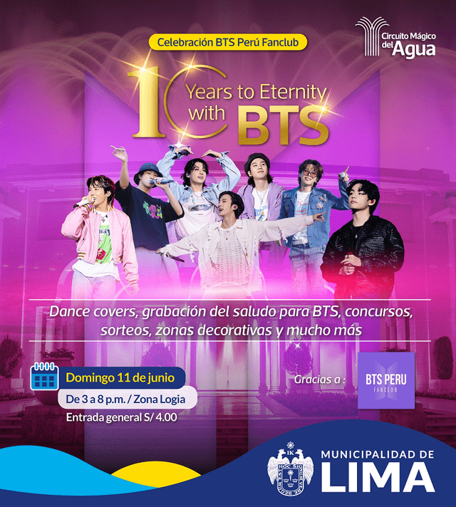 Este 13 de junio los fans de todo el mundo celebrarán el décimo aniversario de la banda y su club de fans Army de Perú no es la excepción. ” 10 years to eternity with BTS” ( 10 años de eternidad con BTS) será el nombre de dicha celebración y se llevará a cabo este domingo 11 de junio de 3.00 p.m a 8.00 p.m en el Circuito Mágico del Agua.