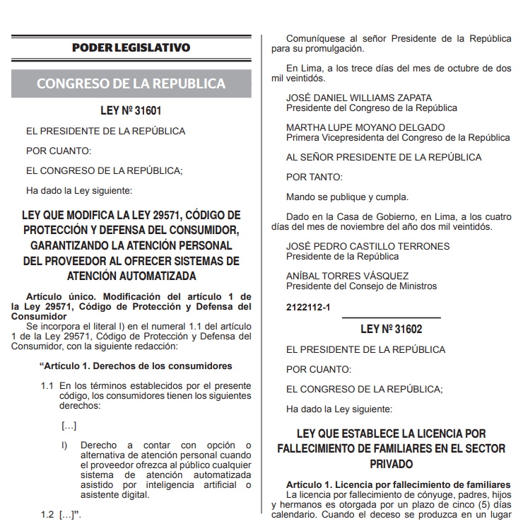 Tal como lo mencionó el congresista de Acción Popular la Ley N° 31601, promulgada el 05 de noviembre de 2022 y referida a la implementación de sistemas de atención automatizada asistida por inteligencia artificial (IA), establece el derecho de los consumidores a contar con una alternativa de atención personal.
