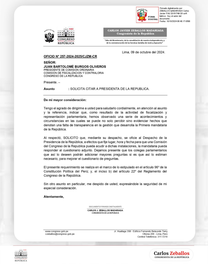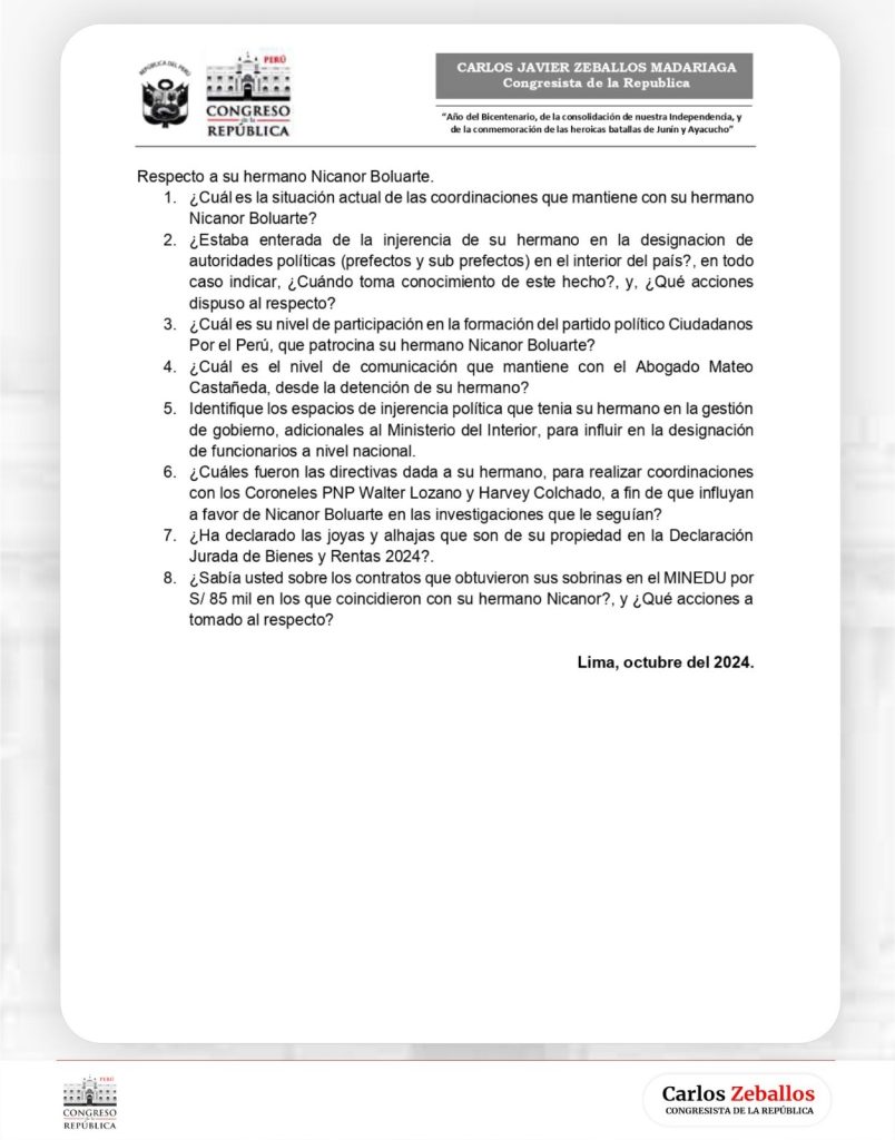 “Solicito que, mediante su despacho, se oficie al Despacho de la Presidencia de la República, a efectos que fije lugar, hora y fecha para que una Comisión del Congreso de la República pueda acudir a dichas instalaciones, la mandataria pueda responder al cuestionario adjunto“.