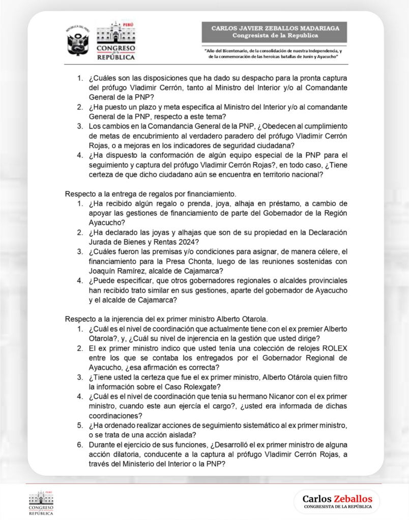 El pliego consta de 6 secciones, teniendo, en primer lugar, 6 preguntas sobre el uso del vehículo presidencial, conocido como ‘cofre’, y 4 interrogantes respecto a las operaciones de búsqueda de Vladimir Cerrón, quien hasta ahora permanece en la clandestinidad tras haber sido sentenciado por el caso Aeródromo Wanka.