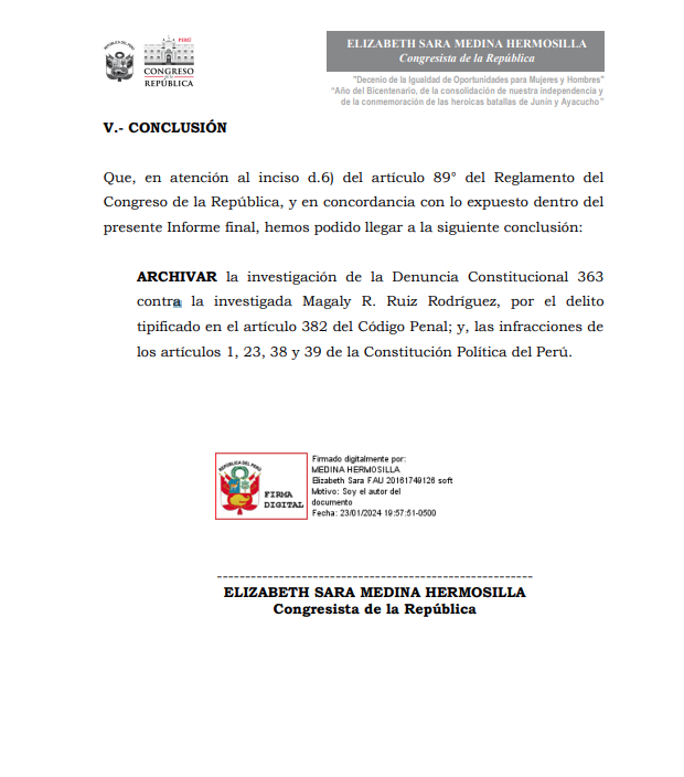 Este informe final que recomienda el archivamiento de la denuncia en contra de la congresista Magaly Ruiz aún será sometido a votación por la Subcomisión de Acusaciones Constitucionales del Congreso el próximo 30 de enero.