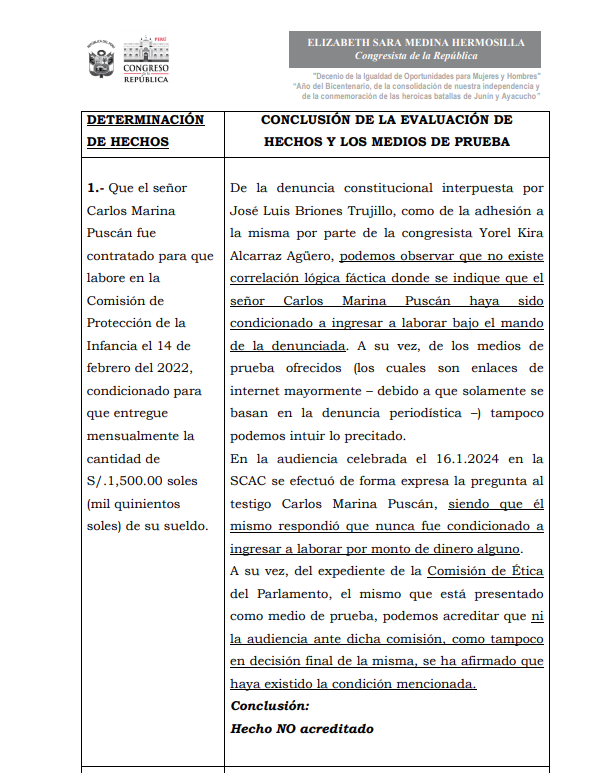 “… podemos observar que no existe correlación lógica fáctica donde se indique que el señor Carlos Marina Puscán haya sido condicionado a ingresar a laborar por el señor Jhony Romero Niña, asesor principal de la congresista denunciada”, se lee en el informe.