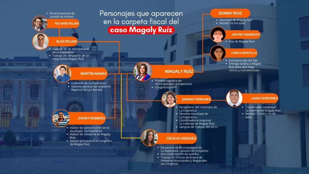 “La estructura en torno a la congresista Ruíz incluye a personas como Martín Namay, gerente regional del gobierno de La Libertad y Sandra Terrones, amiga tanto de Magaly Ruiz como de Namay, quienes se beneficiaron con los sueldos de los trabajadores de la congresista”, precisó el periodista.