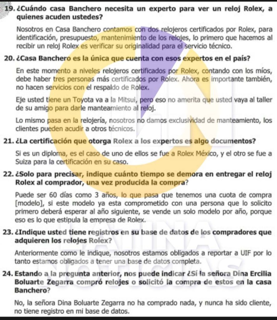 Además, Banchero declaró ante la Fiscalía que no puede confirmar la autenticidad de los relojes que llevaba Boluarte en las fotografías donde fue captada. Precisó que aunque podrían parecer Rolex en la foto, solo con la imagen no puede indicar si es original.