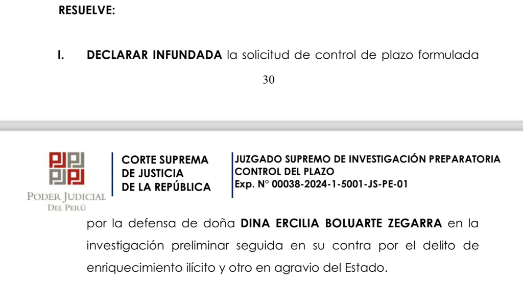 De esta manera, el Poder Judicial sostiene que el plazo de la investigación contra la jefa de Estado se computa desde el 17 de mayo pasado hasta el 16 de enero del 2025. Así, el Ministerio Público podrá realizar pericias, revisar documentación, analizar información como las declaraciones juradas de autoavalúo, ingreso de remuneraciones y actividades privadas.