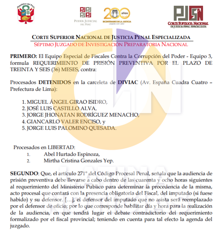 “La audiencia, de carácter inaplazable, se realizará a partir de las 5:30 p. m. en la sede de la CSN en la cuadra 7 de la avenida Tacna. El Ministerio Público ha solicitado que se les imponga 36 meses de prisión preventiva”, informó el Poder Judicial.